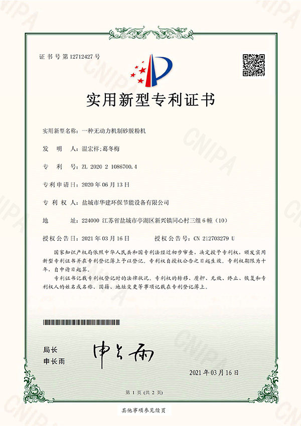 一種無動力機制砂脫粉機-實用新型專利證書